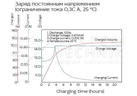 - Срок хранения без подзаряда: 6 мес. при 25°C;
